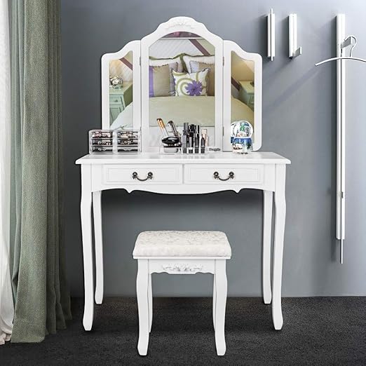 Tri Folding Mirror White Wood Vanity Set Makeup Bathroom Table Dresser 4 Drawers Stool