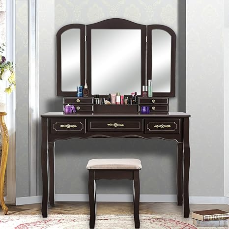 Youke Vanity Set Tri Folding Necklace Hooked Mirror 7 Drawers Makeup Dressing Table With Cushioned Stool Easy Assemble Brown